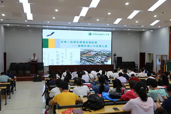 首先,大家共同观看了历城二中宣传片,对学校的基本情况有了了解。随后,副校长岳善华作了《拔尖人才培养的思考与实践——英才教育》主题报告,从我校开展奥赛的背景、方法、取得的成绩等方面分享了我校的英才教育经验。