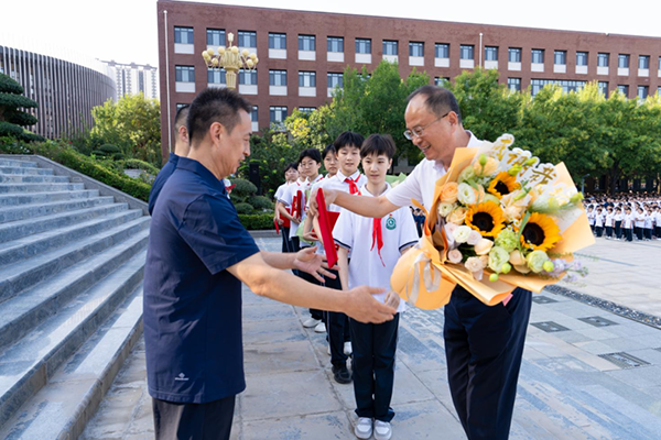 表扬环节简洁庄重,历城二中党委书记李新生为获得表扬的优秀教师代表颁发荣誉证书。一本红证书,一束简洁的鲜花,最朴素的仪式映衬着一位位质朴的教师,台下孩子们此起彼伏的掌声和踮脚张望的笑脸,是对所有教师辛勤付出的最好回应。