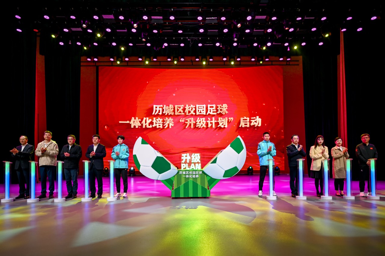 与会领导和女足队员代表张雪琪、男足队员代表魏明宇上台,共同启动历城区校园足球一体化培养“升级计划”。