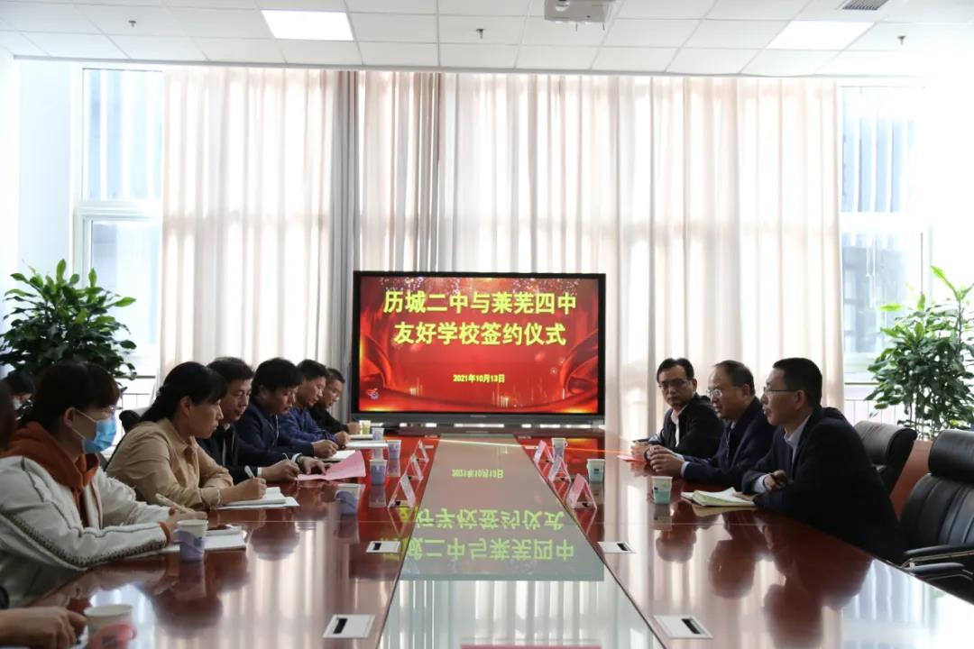 最后,历城二中执行校长李矿水和莱芜四中校长刘刚代表双方签订友好学校协议书。