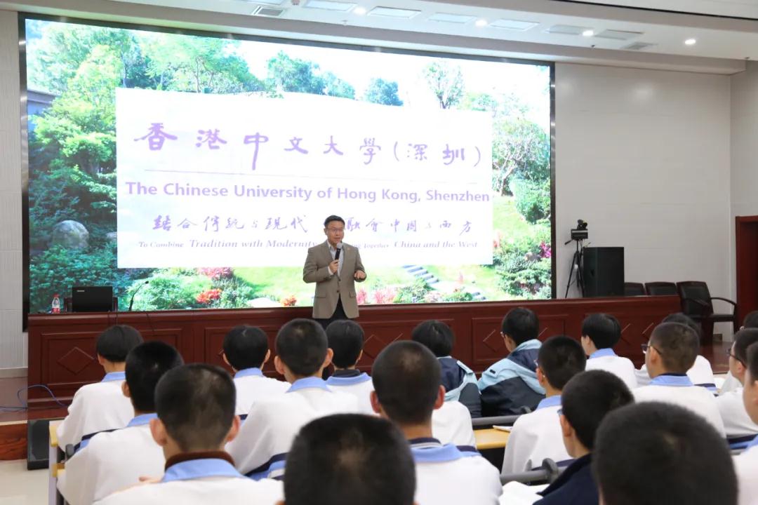柯处长首先介绍了香港中文大学(深圳)的创校历史、办学理念,“香港中文大学为什么叫中文大学?”一开场的小问题让在场的同学们纷纷开动脑筋积极回答。随后,柯处长介绍了香港中文大学(深圳)雄厚的师资力量、先进的硬件设施、浓厚的学术氛围和学校未来发展情况等。他表示,香港中文大学(深圳)拥有现代化大学管理体制和国际认可的学术水平,聘用全球一流师资,致力于在国际化的教学氛围中培养学生的国际视野。