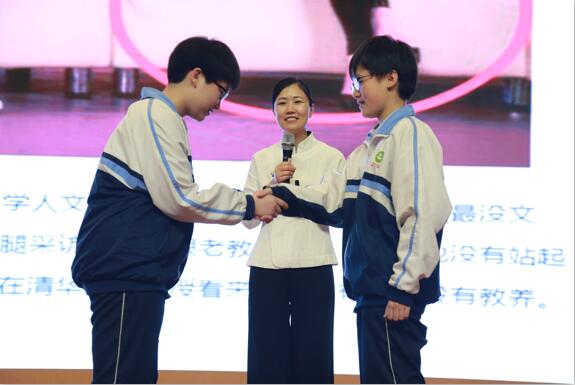 上午9点整,在热烈的掌声中,国学经典教育讲师王玉娟老师走上讲台,对高二全体同学开始了对“礼”、“孝”的讲授。