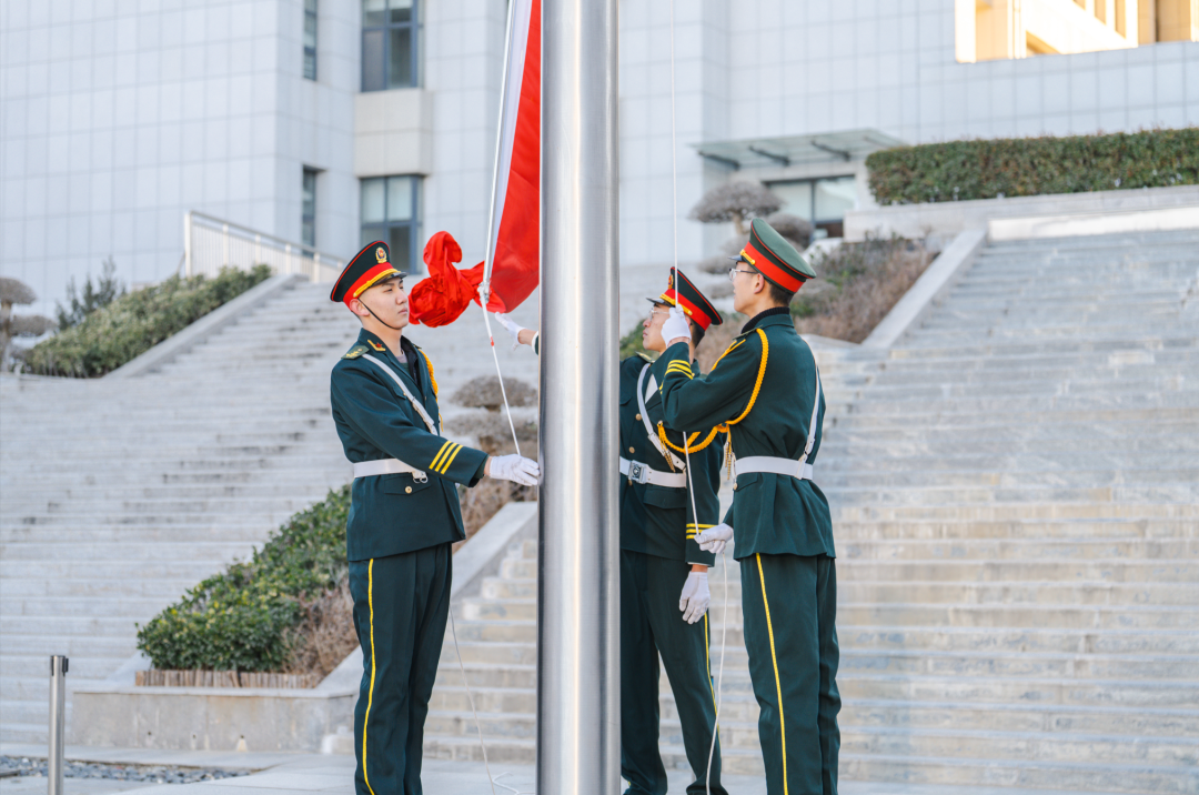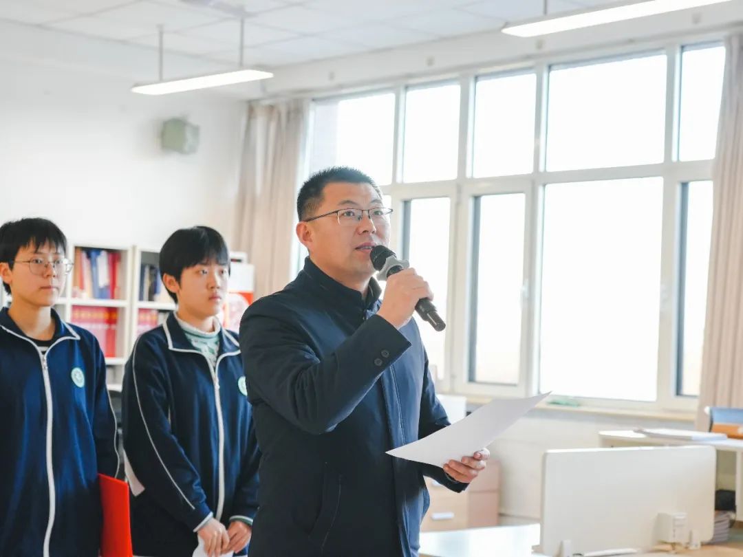 由于天气寒冷,升旗仪式转为室内举行。本次升旗仪式由韩托老师带领的高二15班负责,学生孟怡辰担任主持人。