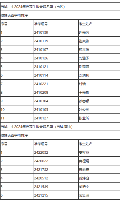 按照济南市2024年高中阶段学校招生工作要求及我校2024年推荐生招生工作方案,我校通过对考生进行资格审查、基本素养考查、综合能力考查,按照综合成绩排名,确定市区11名(2名考生同分并列)和历城(含南管会)200名同学为我校拟录取推荐生,现予以公示(名单按姓氏首字母排序),公示期3天。欢迎社会监督,监督电话:0531-88161285。