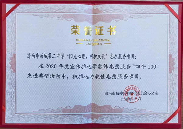 近日,济南市精神文明建设委员会办公室公布2020年度济南市“最美志愿者、最佳志愿服务项目、最佳志愿服务组织、最美志愿服务社区”先进典型名单,历城二中“阳光心理,呵护成长”志愿服务项目被选为济南市2020年度最佳志愿服务项目。